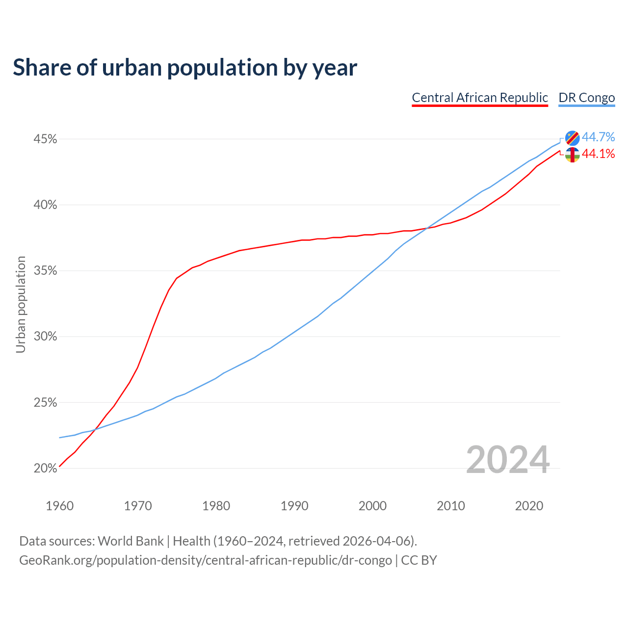 From 2004 to 2024, the share of urban population changed from 38% to 44.1% in the Central African Republic and from 37% to 44.7% in the DR Congo.