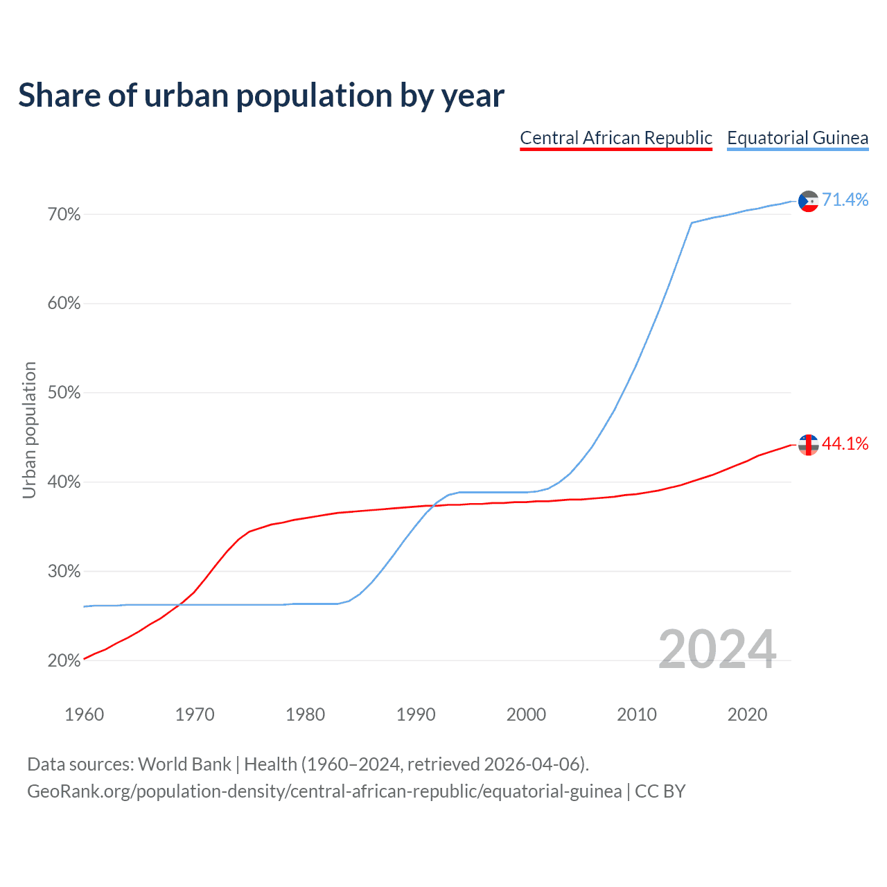 From 2004 to 2024, the share of urban population changed from 38% to 44.1% in the Central African Republic and from 40.9% to 71.4% in Equatorial Guinea.