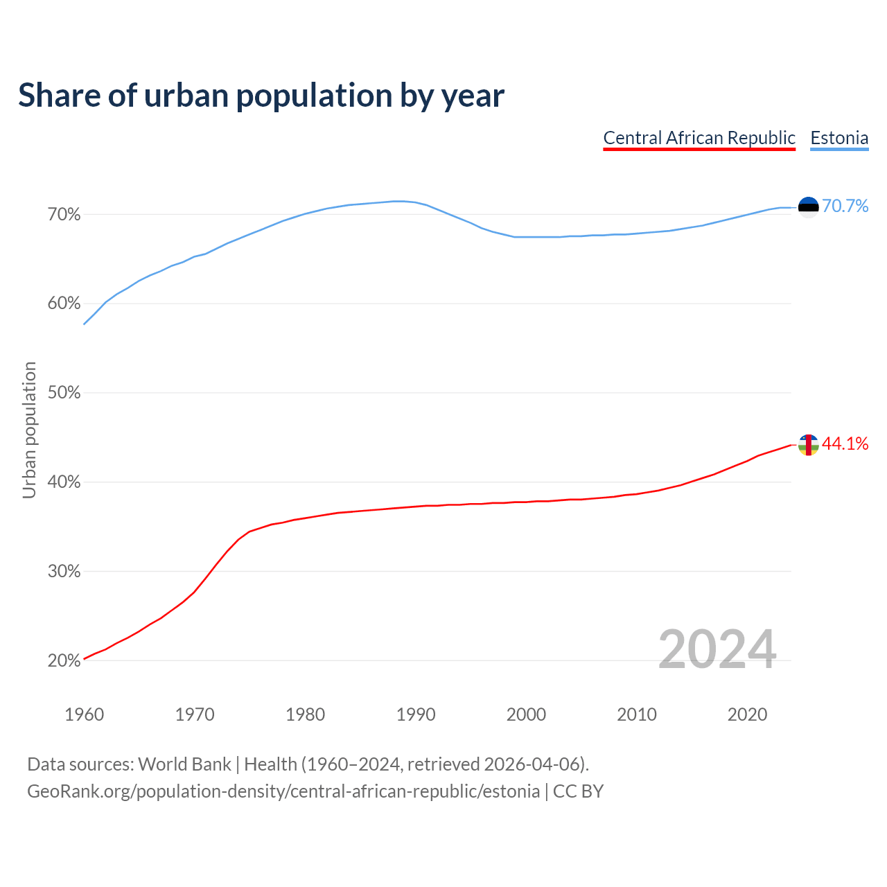 From 2004 to 2024, the share of urban population changed from 38% to 44.1% in the Central African Republic and from 67.5% to 70.7% in Estonia.