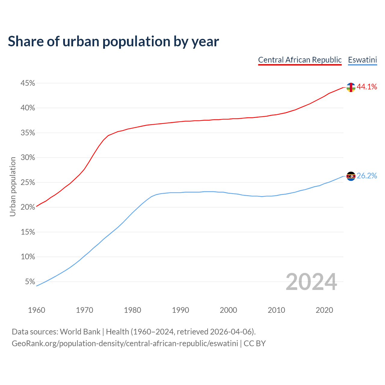 From 2004 to 2024, the share of urban population changed from 38% to 44.1% in the Central African Republic and from 22.3% to 26.2% in Eswatini.
