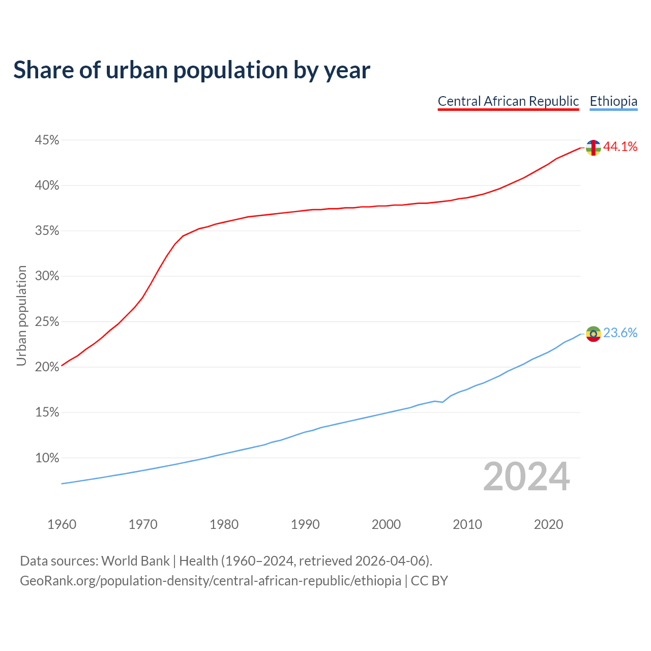 From 2004 to 2024, the share of urban population changed from 38% to 44.1% in the Central African Republic and from 15.8% to 23.6% in Ethiopia.