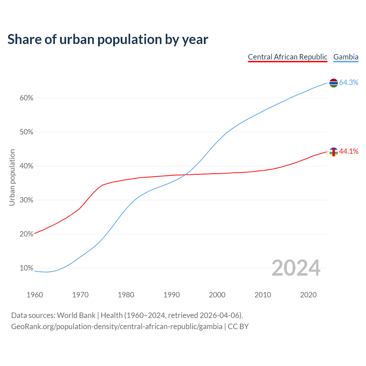 From 2004 to 2024, the share of urban population changed from 38% to 44.1% in the Central African Republic and from 51.5% to 64.3% in the Gambia.