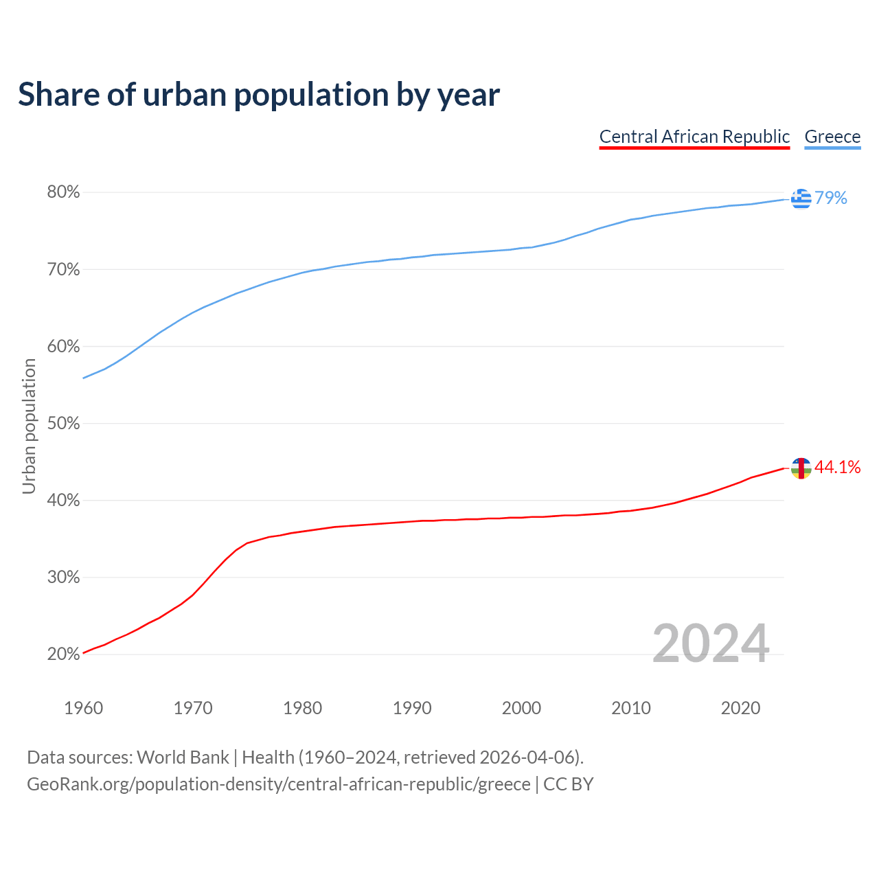 From 2004 to 2024, the share of urban population changed from 38% to 44.1% in the Central African Republic and from 73.8% to 79% in Greece.