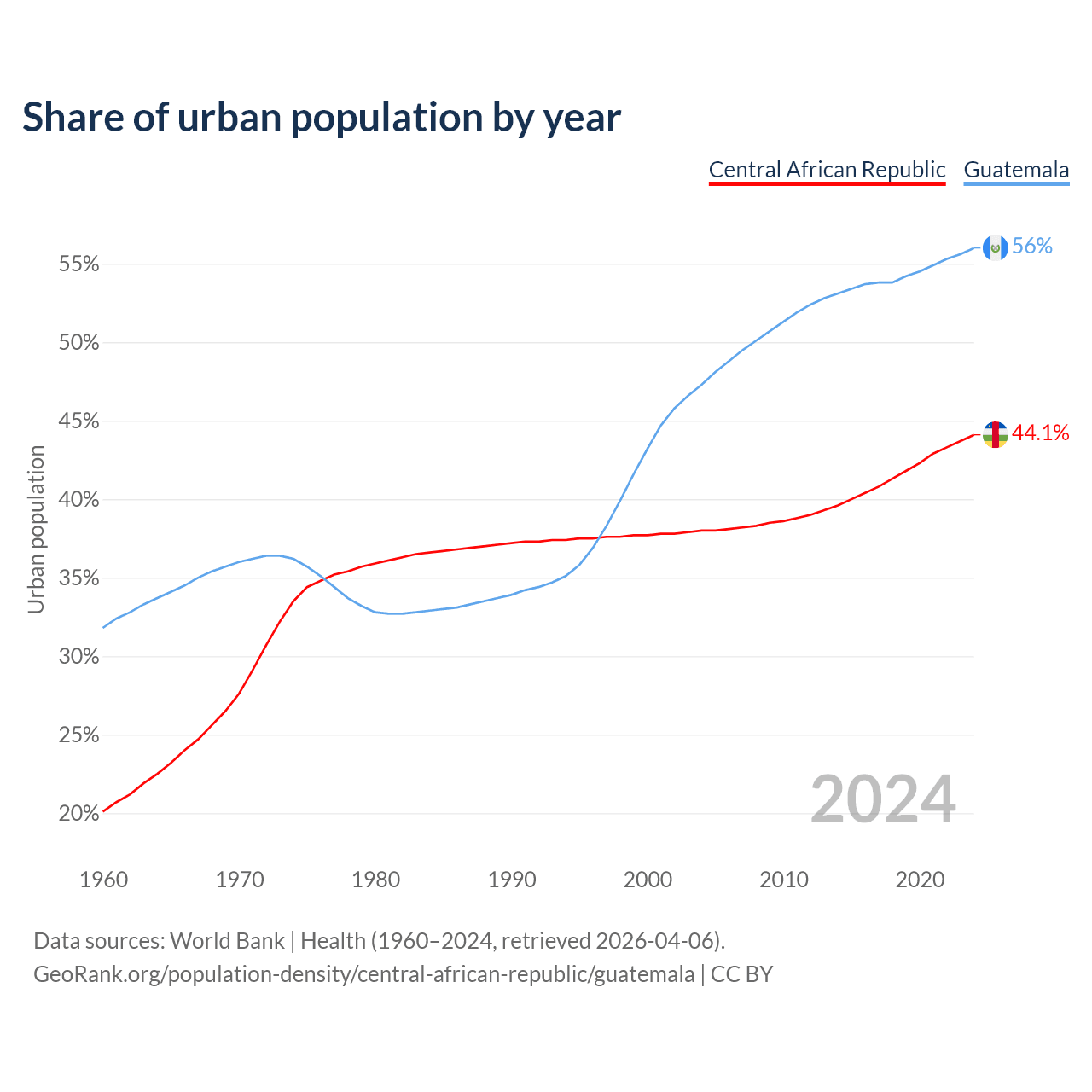 From 2004 to 2024, the share of urban population changed from 38% to 44.1% in the Central African Republic and from 47.3% to 56% in Guatemala.