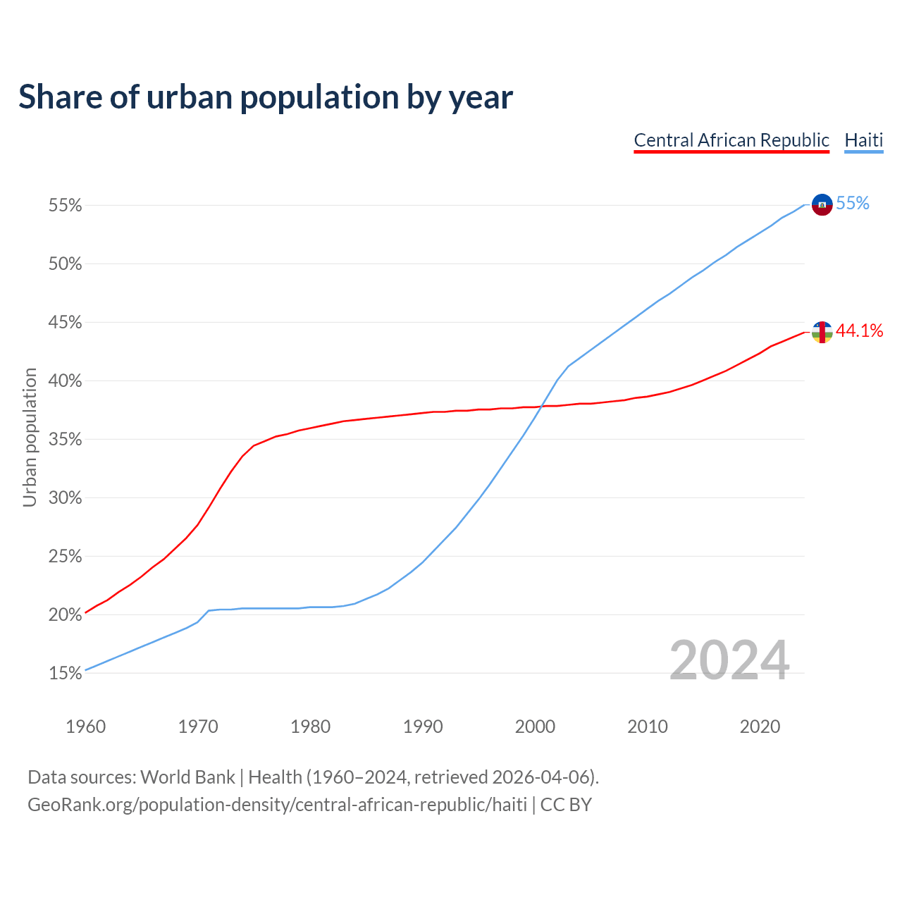 From 2004 to 2024, the share of urban population changed from 38% to 44.1% in the Central African Republic and from 41.9% to 55% in Haiti.