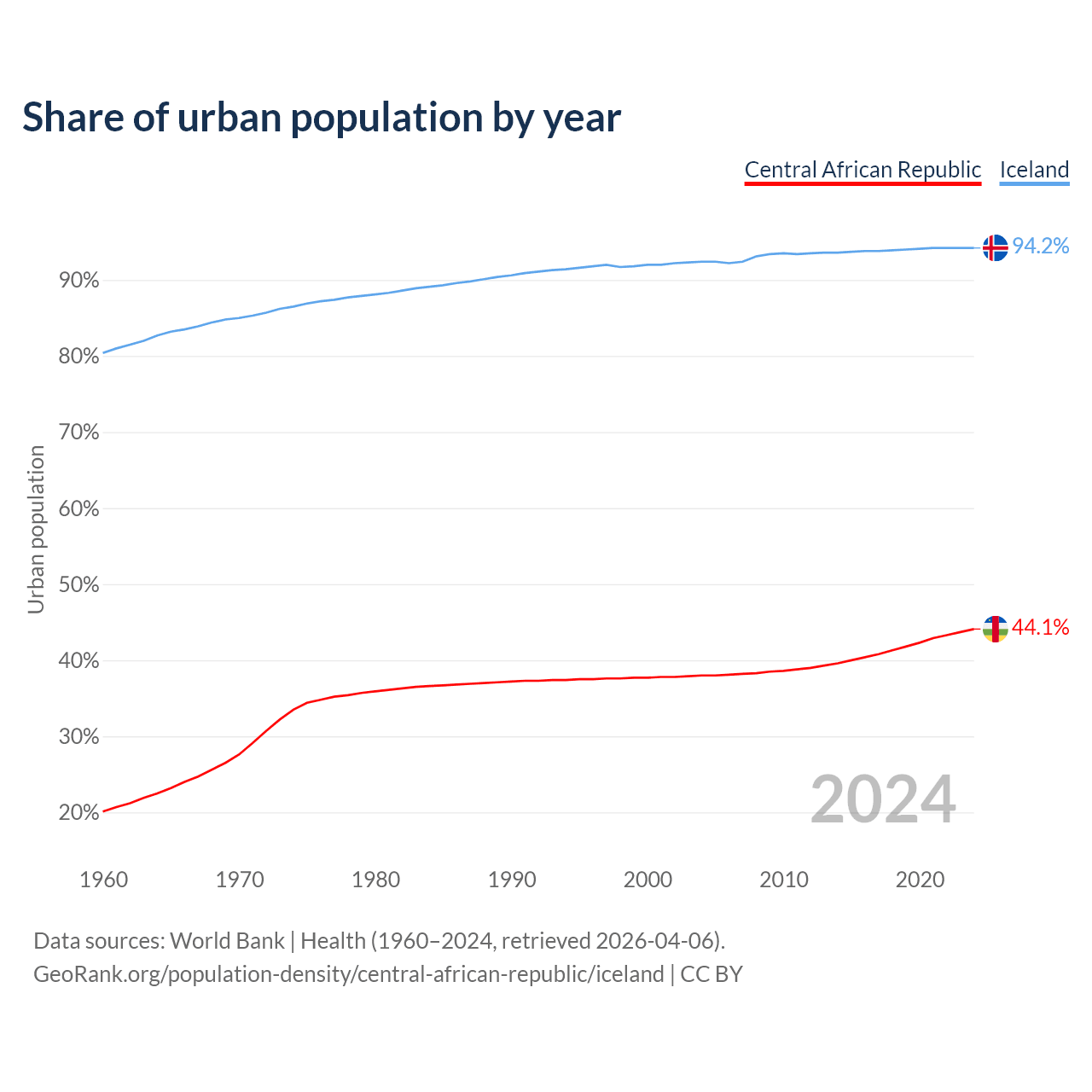 From 2004 to 2024, the share of urban population changed from 38% to 44.1% in the Central African Republic and from 92.4% to 94.2% in Iceland.