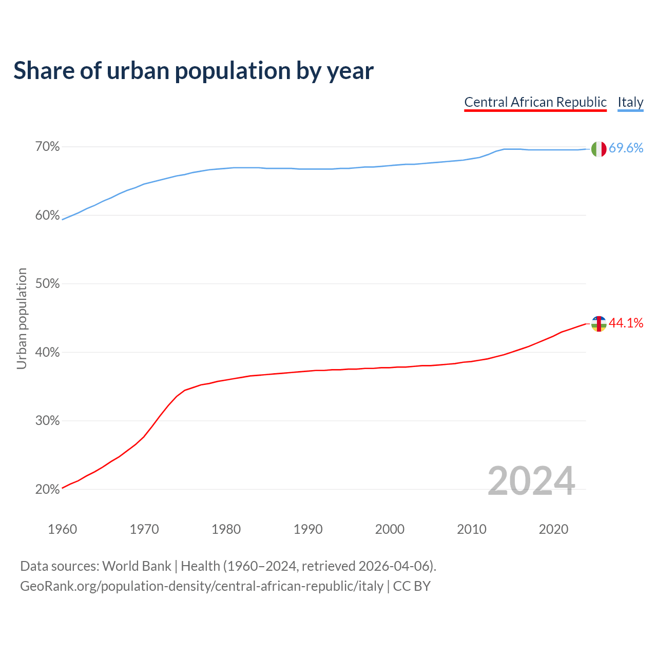 From 2004 to 2024, the share of urban population changed from 38% to 44.1% in the Central African Republic and from 67.5% to 69.6% in Italy.