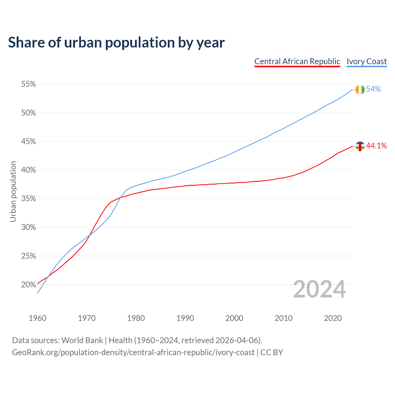 From 2004 to 2024, the share of urban population changed from 38% to 44.1% in the Central African Republic and from 44.7% to 54% in Ivory Coast.