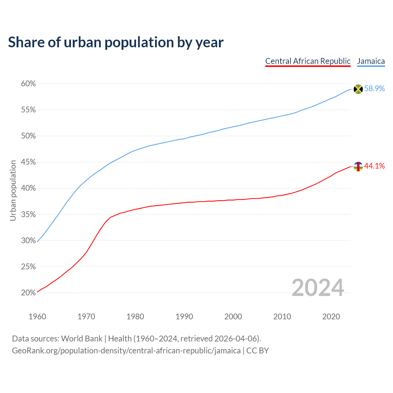 From 2004 to 2024, the share of urban population changed from 38% to 44.1% in the Central African Republic and from 52.6% to 58.9% in Jamaica.