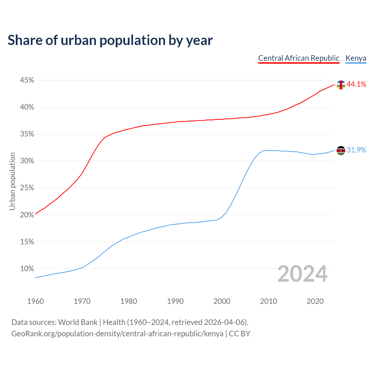 From 2004 to 2024, the share of urban population changed from 38% to 44.1% in the Central African Republic and from 25.4% to 31.9% in Kenya.