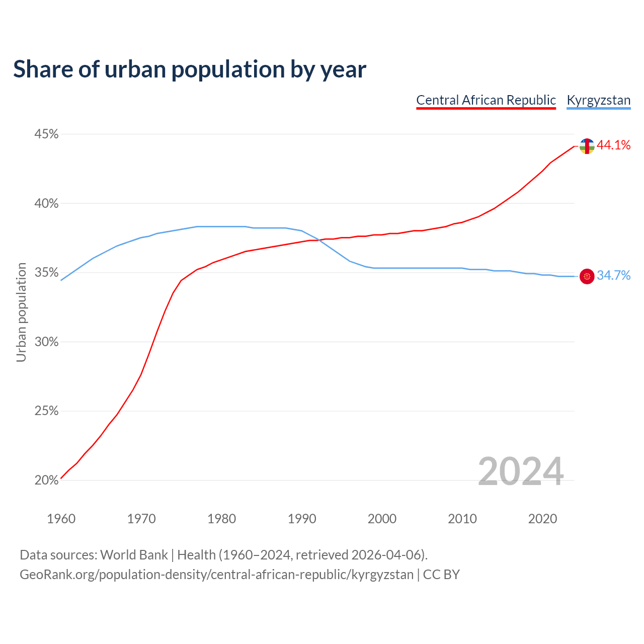 From 2004 to 2024, the share of urban population changed from 38% to 44.1% in the Central African Republic and from 35.3% to 34.7% in Kyrgyzstan.