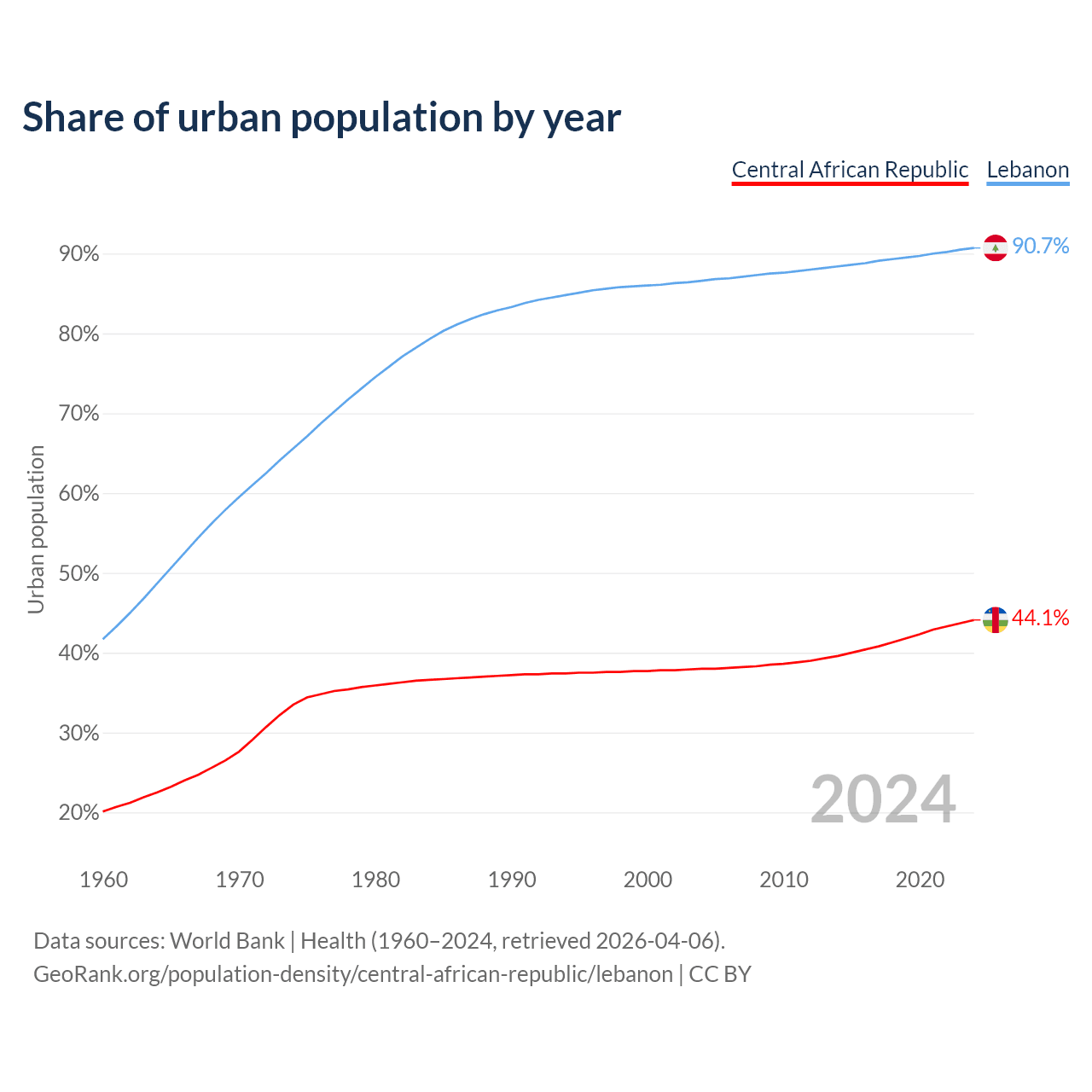 From 2004 to 2024, the share of urban population changed from 38% to 44.1% in the Central African Republic and from 86.6% to 90.7% in Lebanon.