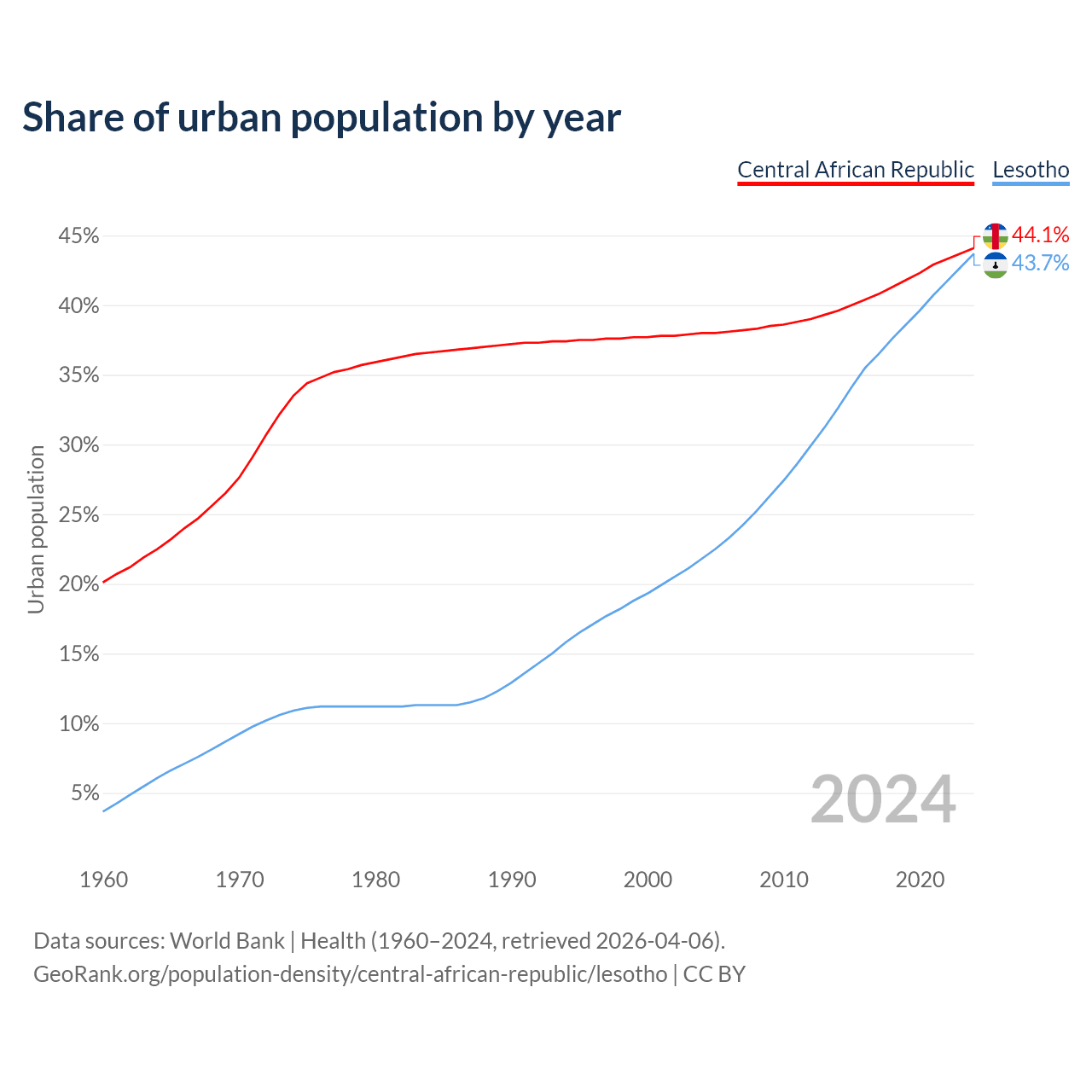 From 2004 to 2024, the share of urban population changed from 38% to 44.1% in the Central African Republic and from 21.8% to 43.7% in Lesotho.