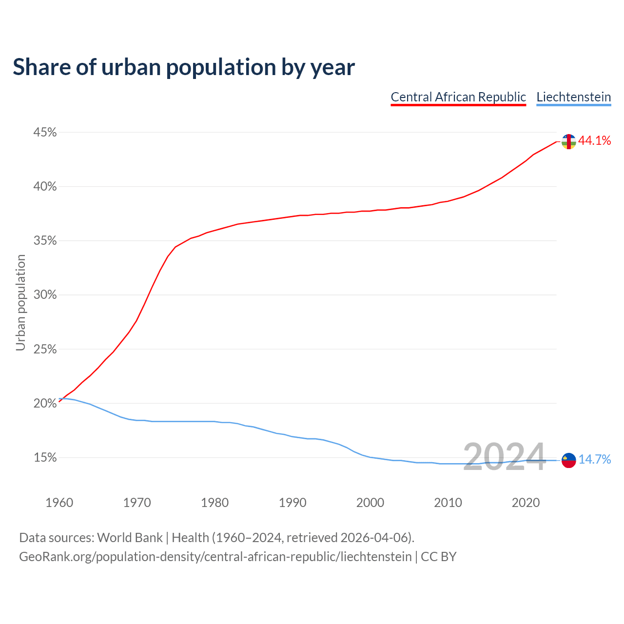 From 2004 to 2024, the share of urban population changed from 38% to 44.1% in the Central African Republic and from 14.7% to 14.7% in Liechtenstein.