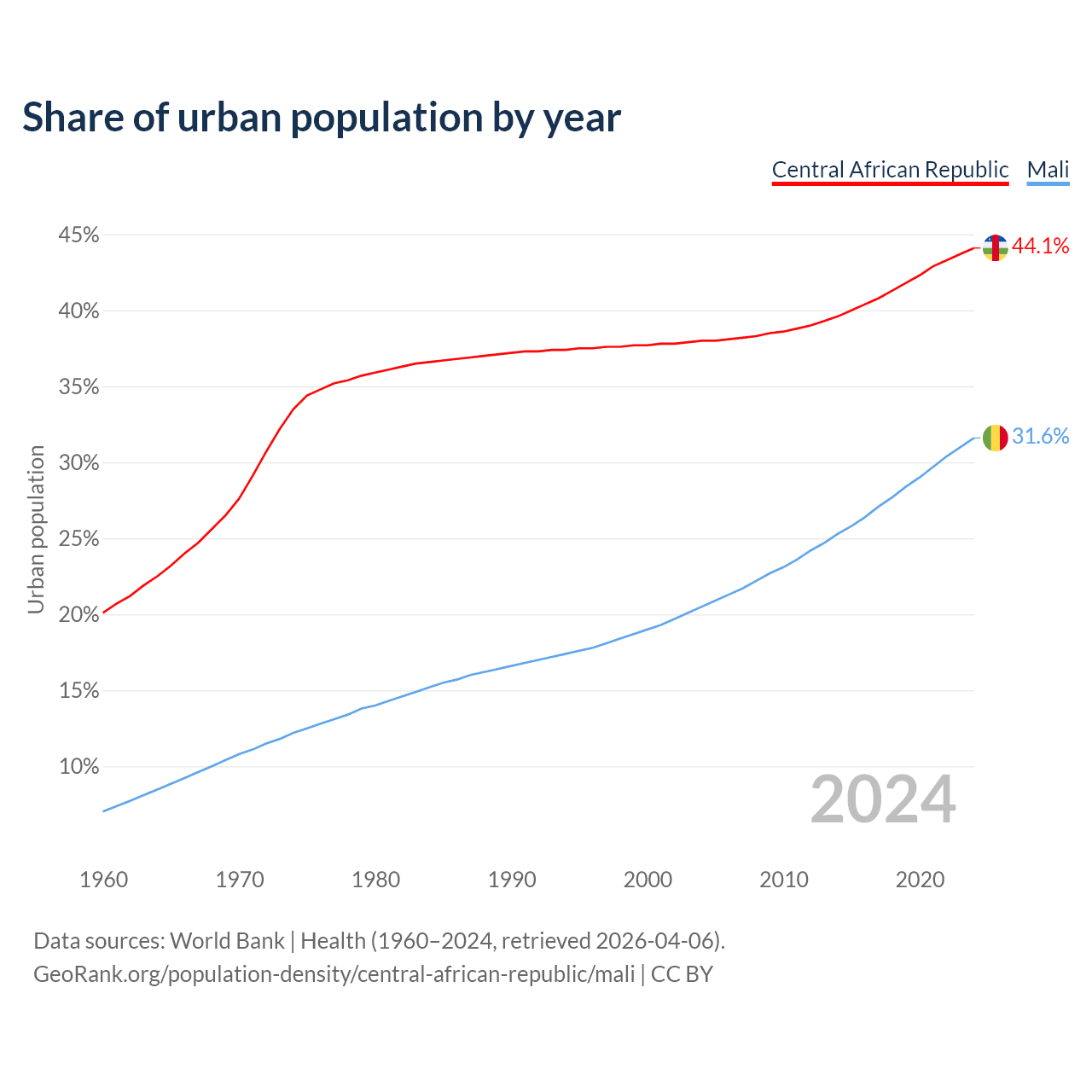 From 2004 to 2024, the share of urban population changed from 38% to 44.1% in the Central African Republic and from 20.5% to 31.6% in Mali.