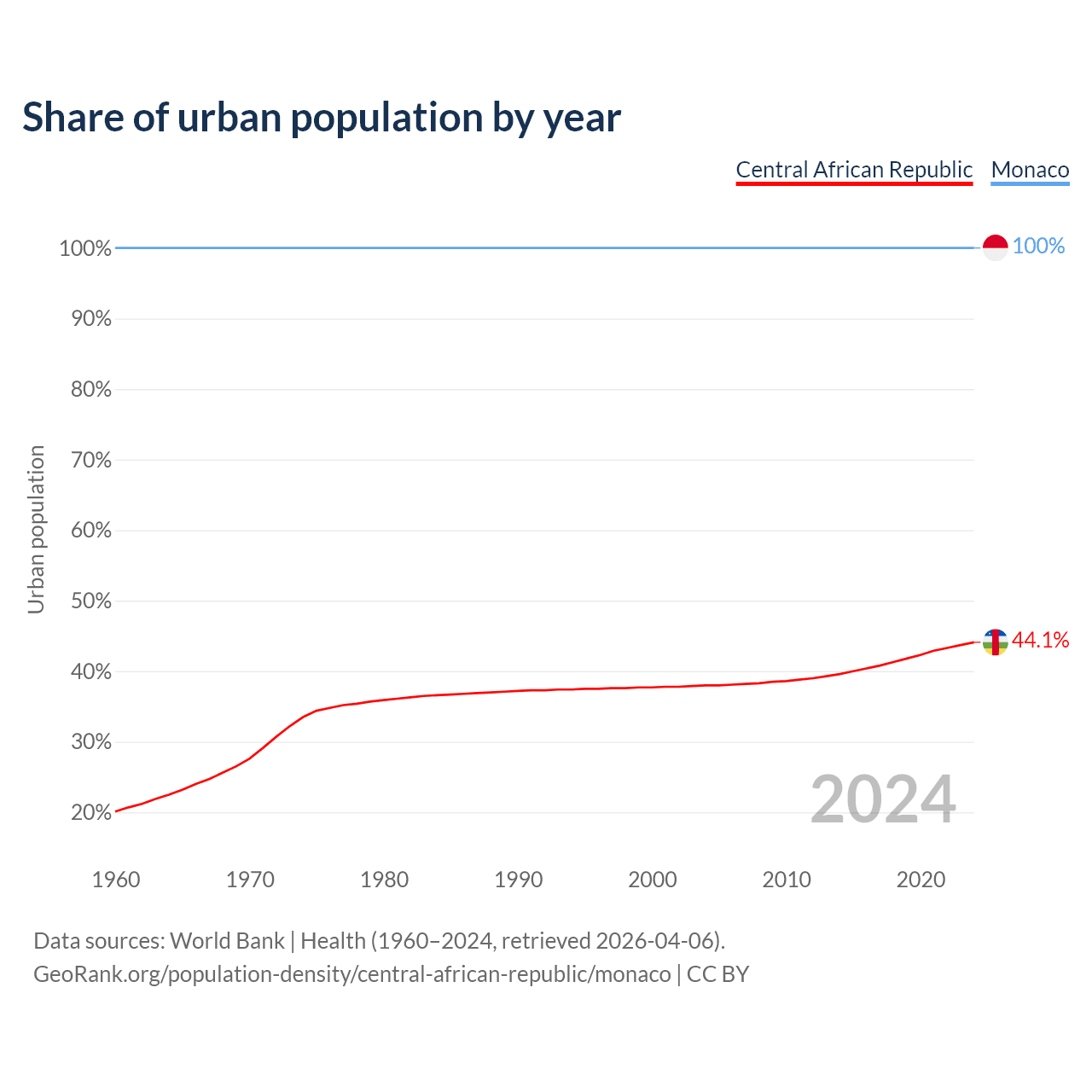 From 2004 to 2024, the share of urban population changed from 38% to 44.1% in the Central African Republic and from 100% to 100% in Monaco.