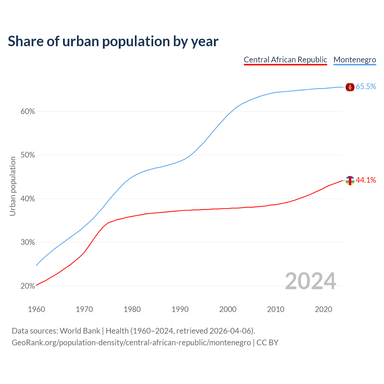 From 2004 to 2024, the share of urban population changed from 38% to 44.1% in the Central African Republic and from 62.2% to 65.5% in Montenegro.