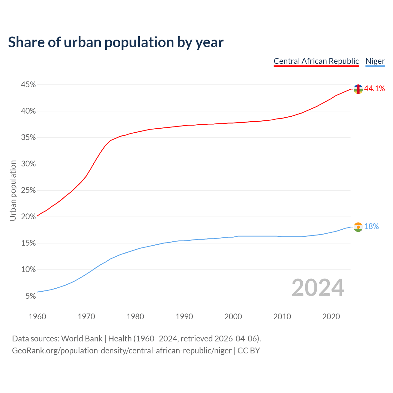From 2004 to 2024, the share of urban population changed from 38% to 44.1% in the Central African Republic and from 16.3% to 18% in Niger.