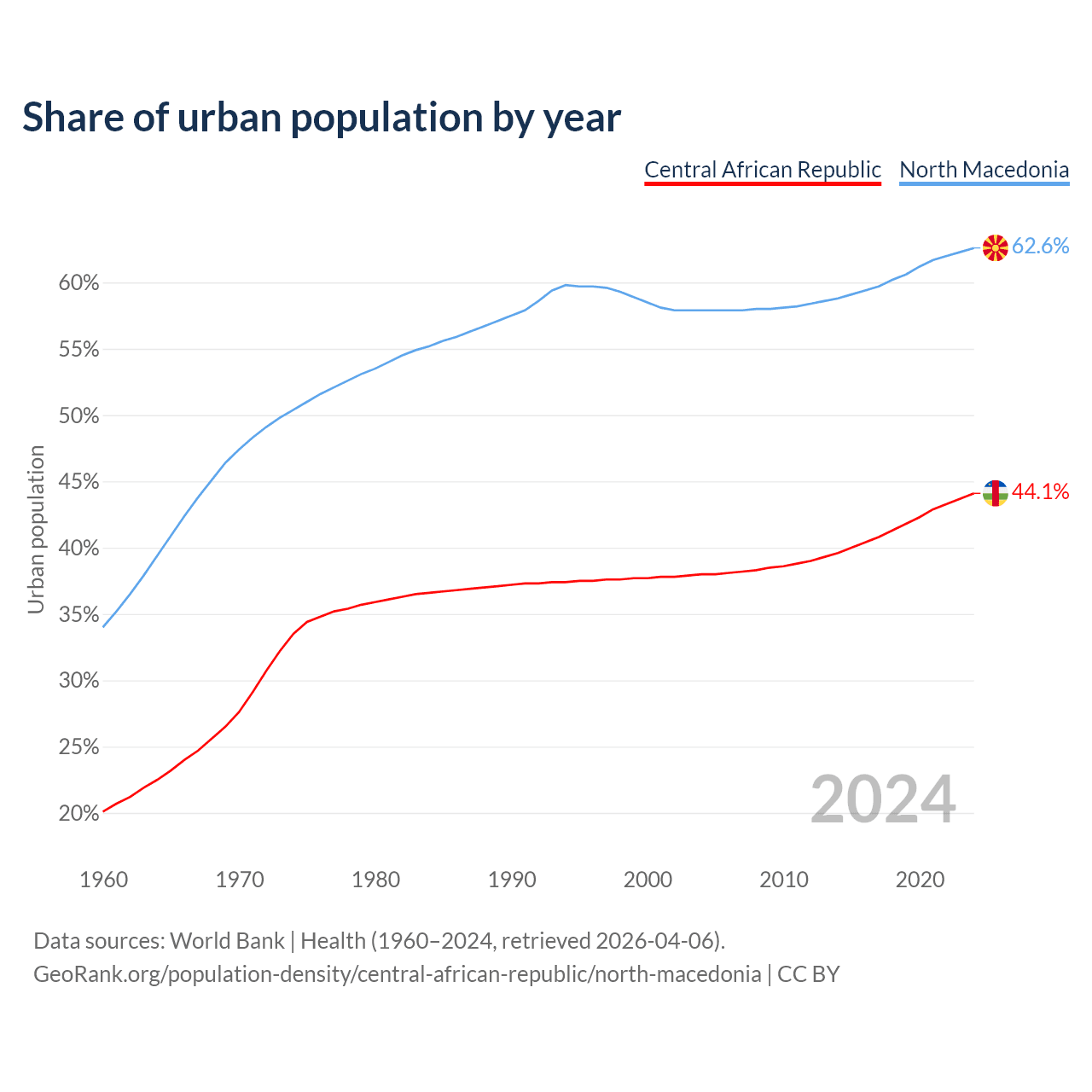 From 2004 to 2024, the share of urban population changed from 38% to 44.1% in the Central African Republic and from 57.9% to 62.6% in North Macedonia.