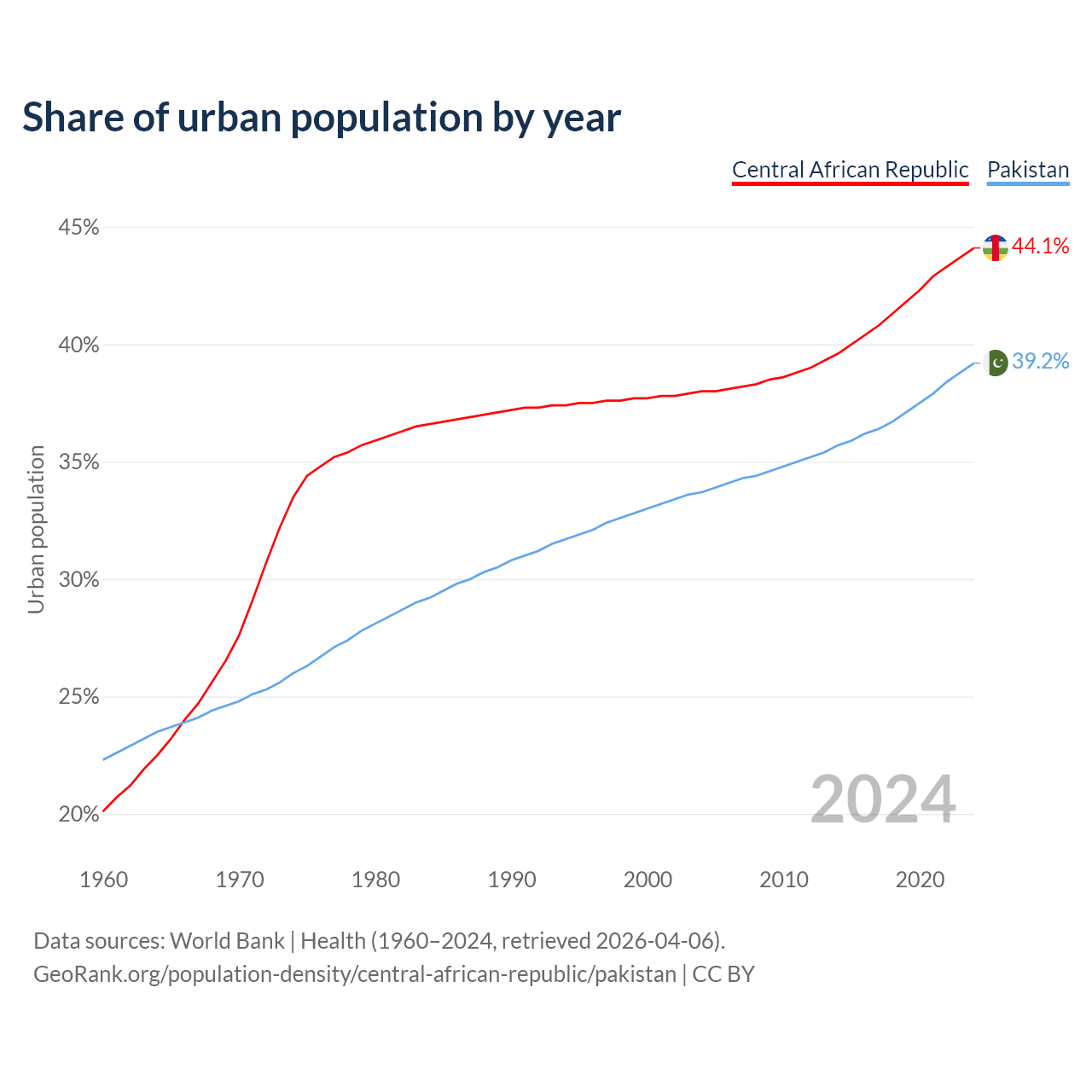 From 2004 to 2024, the share of urban population changed from 38% to 44.1% in the Central African Republic and from 33.7% to 39.2% in Pakistan.