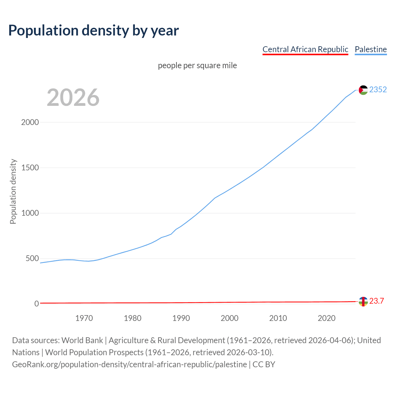 The Central African Republic has a population density of 23.7 people per square mile compared to 2,352 people in Palestine. The Central African Republic has 1,257,950 sq ft of land per person vs 12,251 sq ft in Palestine. The Central African Republic and Palestine rank 185th and 8th by population density, respectively.