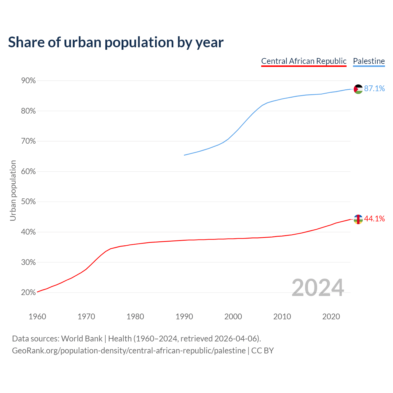 From 2004 to 2024, the share of urban population changed from 38% to 44.1% in the Central African Republic and from 79% to 87.1% in Palestine.