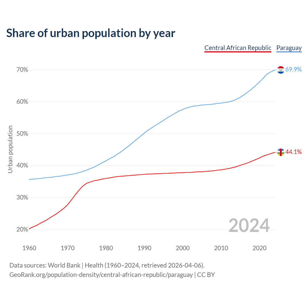 From 2004 to 2024, the share of urban population changed from 38% to 44.1% in the Central African Republic and from 58.7% to 69.9% in Paraguay.