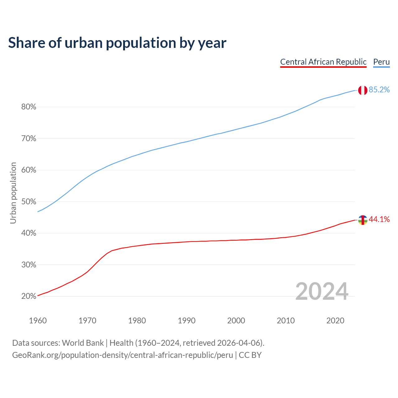 From 2004 to 2024, the share of urban population changed from 38% to 44.1% in the Central African Republic and from 74.4% to 85.2% in Peru.