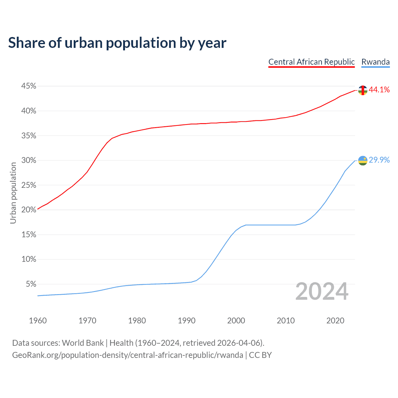 From 2004 to 2024, the share of urban population changed from 38% to 44.1% in the Central African Republic and from 16.9% to 29.9% in Rwanda.