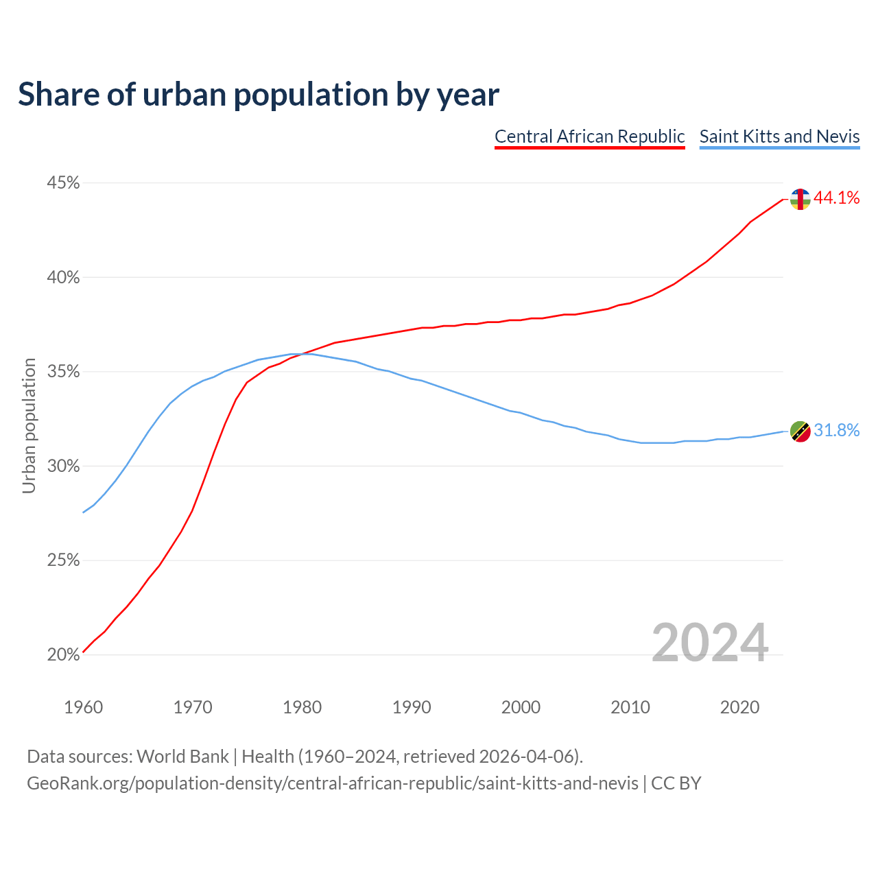 From 2004 to 2024, the share of urban population changed from 38% to 44.1% in the Central African Republic and from 32.1% to 31.8% in Saint Kitts and Nevis.