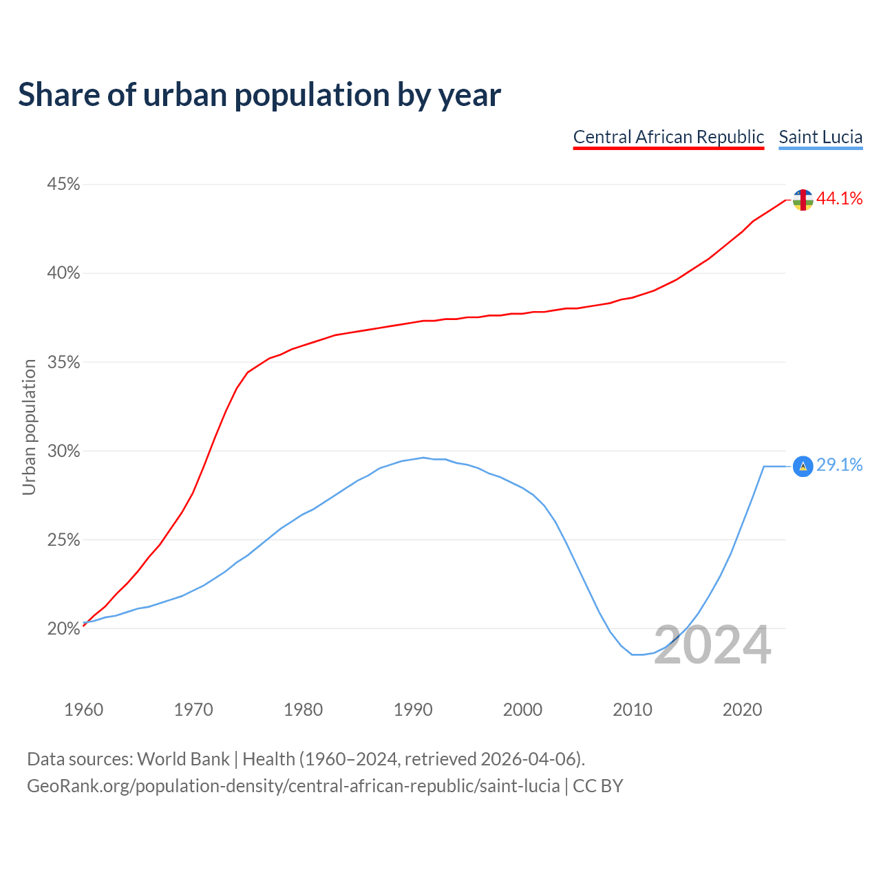 From 2004 to 2024, the share of urban population changed from 38% to 44.1% in the Central African Republic and from 24.8% to 29.1% in Saint Lucia.