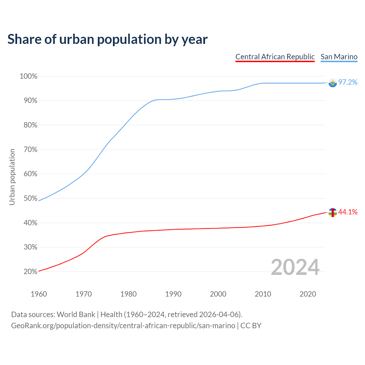 From 2004 to 2024, the share of urban population changed from 38% to 44.1% in the Central African Republic and from 94.2% to 97.2% in San Marino.