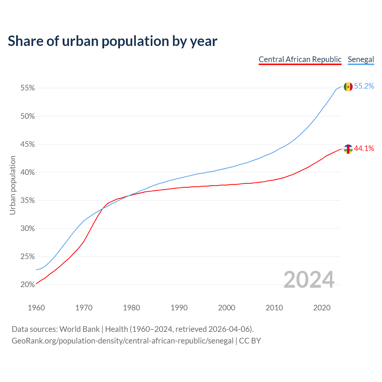 From 2004 to 2024, the share of urban population changed from 38% to 44.1% in the Central African Republic and from 41.6% to 55.2% in Senegal.