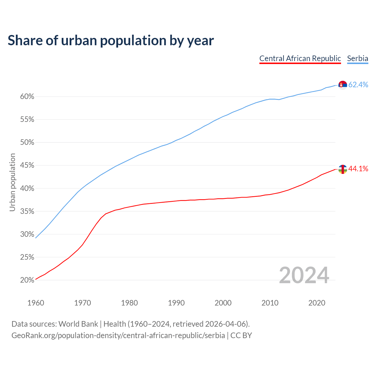 From 2004 to 2024, the share of urban population changed from 38% to 44.1% in the Central African Republic and from 57.3% to 62.4% in Serbia.