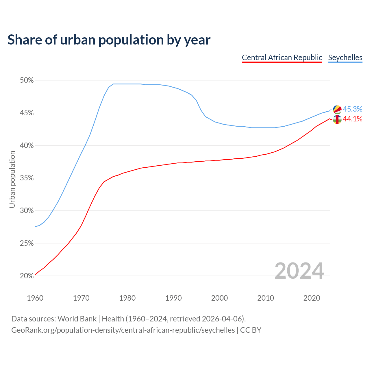 From 2004 to 2024, the share of urban population changed from 38% to 44.1% in the Central African Republic and from 42.9% to 45.3% in the Seychelles.