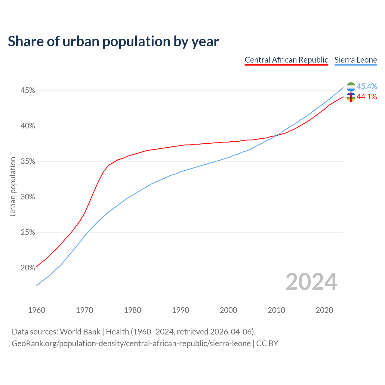 From 2004 to 2024, the share of urban population changed from 38% to 44.1% in the Central African Republic and from 36.5% to 45.4% in Sierra Leone.