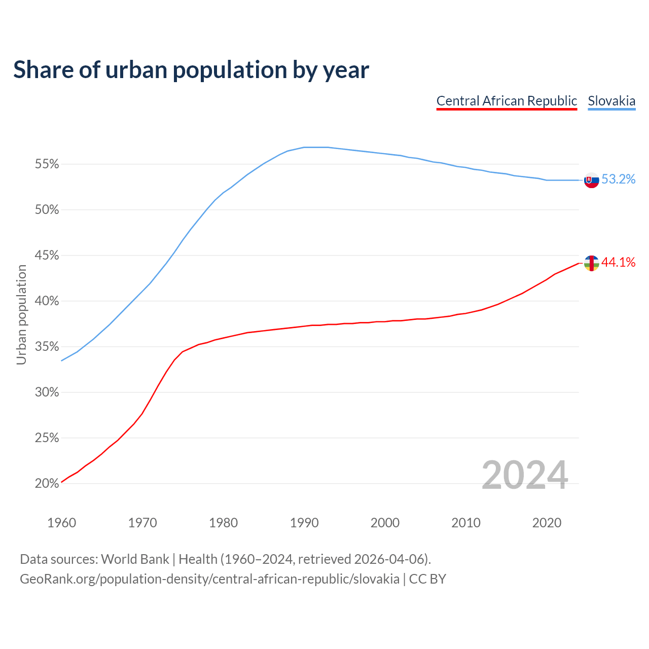 From 2004 to 2024, the share of urban population changed from 38% to 44.1% in the Central African Republic and from 55.6% to 53.2% in Slovakia.