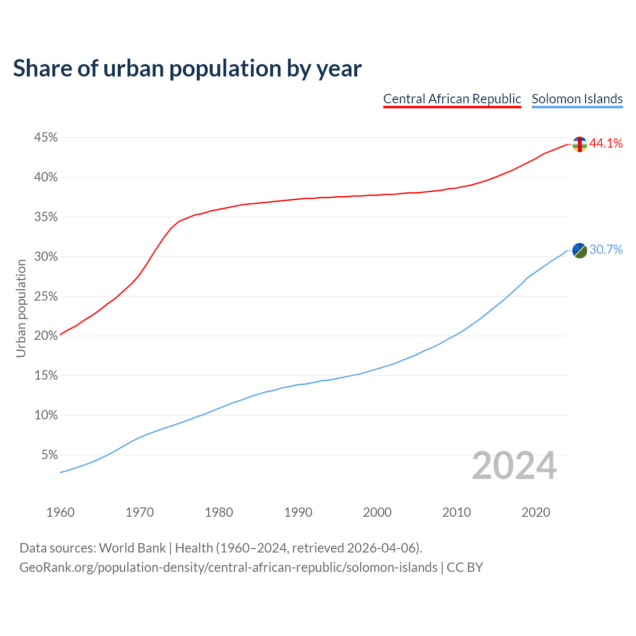 From 2004 to 2024, the share of urban population changed from 38% to 44.1% in the Central African Republic and from 17.2% to 30.7% in the Solomon Islands.