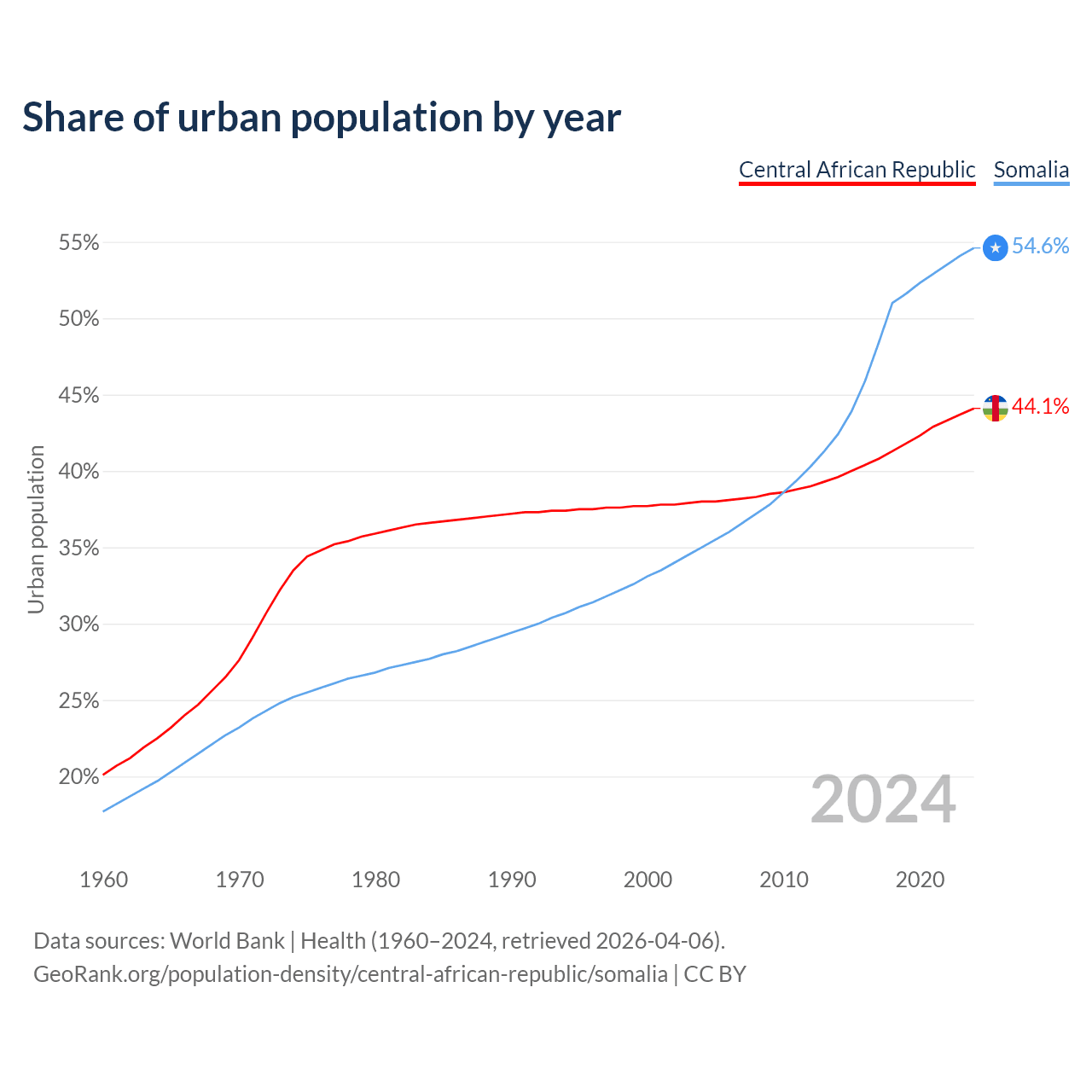 From 2004 to 2024, the share of urban population changed from 38% to 44.1% in the Central African Republic and from 35% to 54.6% in Somalia.