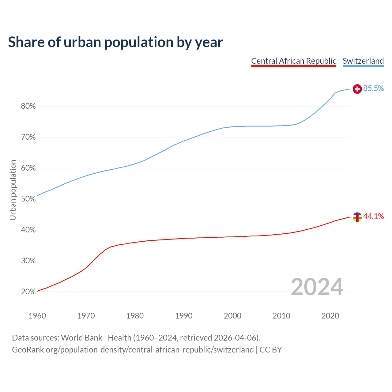 From 2004 to 2024, the share of urban population changed from 38% to 44.1% in the Central African Republic and from 73.5% to 85.5% in Switzerland.