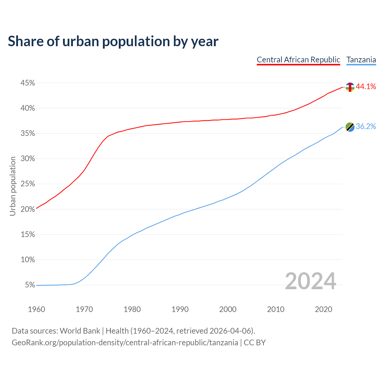 From 2004 to 2024, the share of urban population changed from 38% to 44.1% in the Central African Republic and from 24.1% to 36.2% in Tanzania.