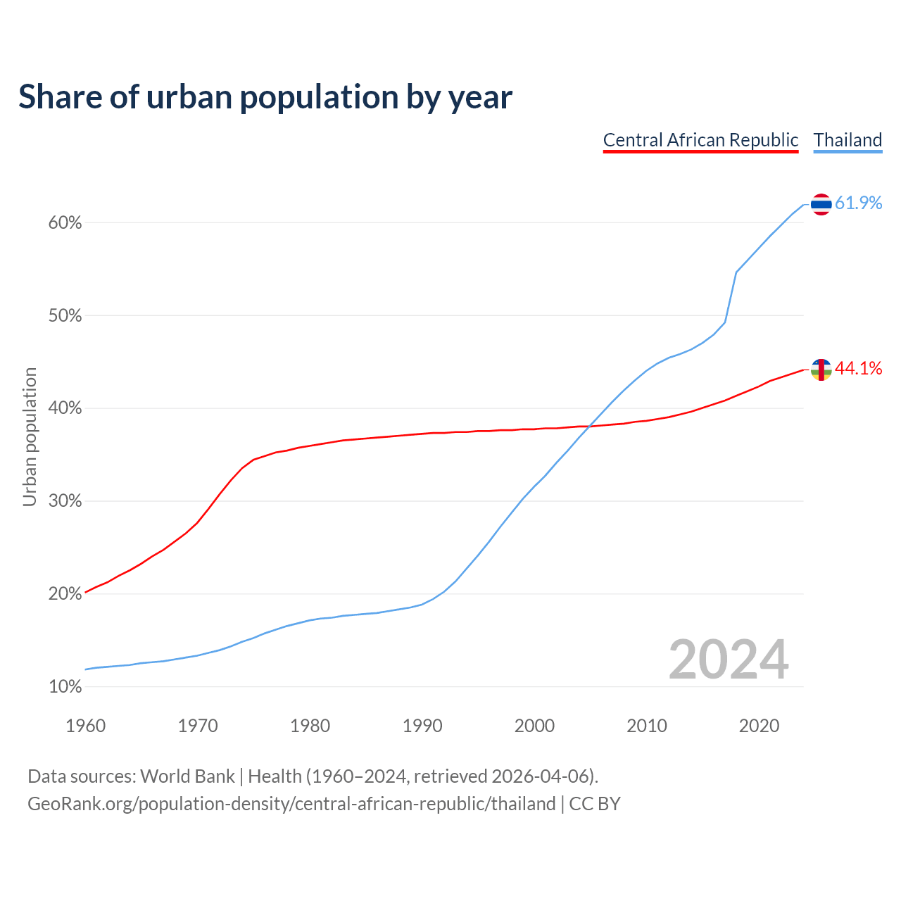 From 2004 to 2024, the share of urban population changed from 38% to 44.1% in the Central African Republic and from 36.8% to 61.9% in Thailand.