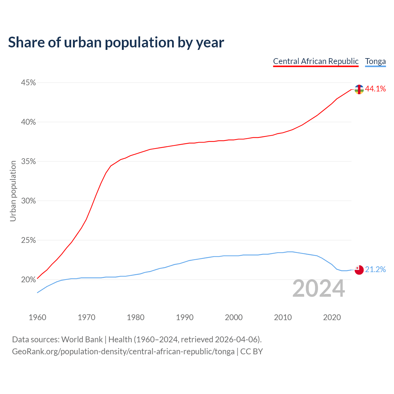 From 2004 to 2024, the share of urban population changed from 38% to 44.1% in the Central African Republic and from 23.1% to 21.2% in Tonga.