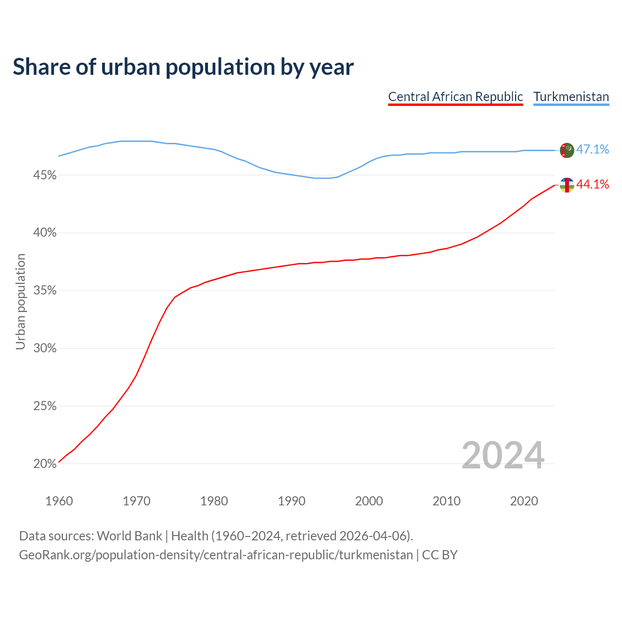 From 2004 to 2024, the share of urban population changed from 38% to 44.1% in the Central African Republic and from 46.7% to 47.1% in Turkmenistan.