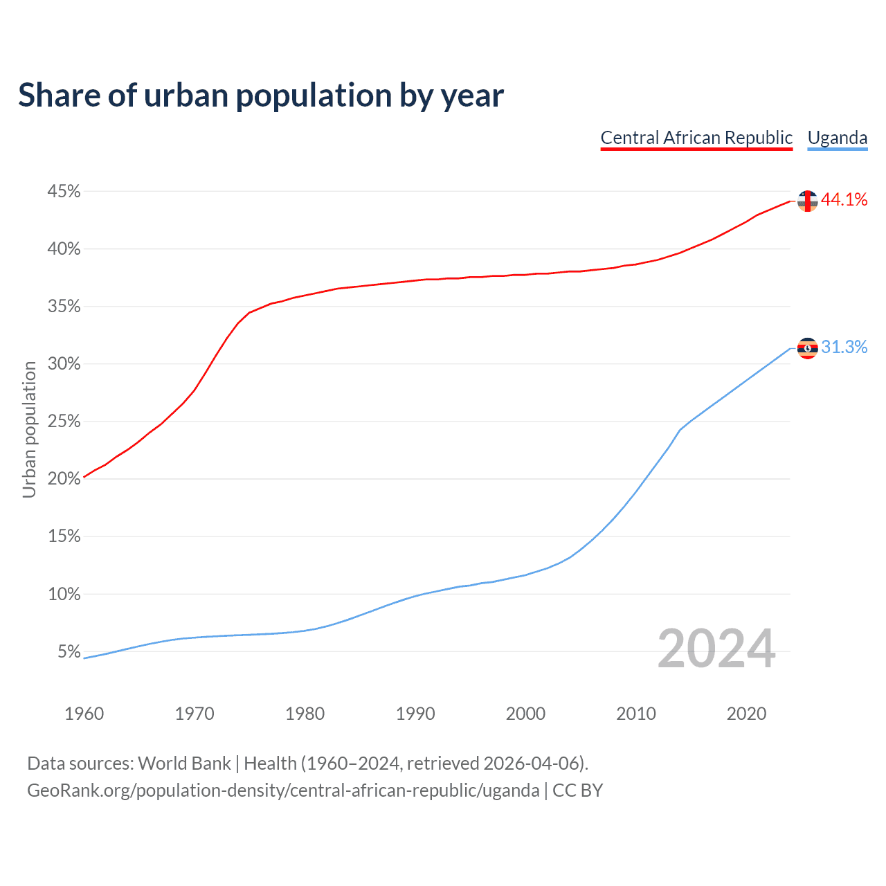 From 2004 to 2024, the share of urban population changed from 38% to 44.1% in the Central African Republic and from 13.1% to 31.3% in Uganda.