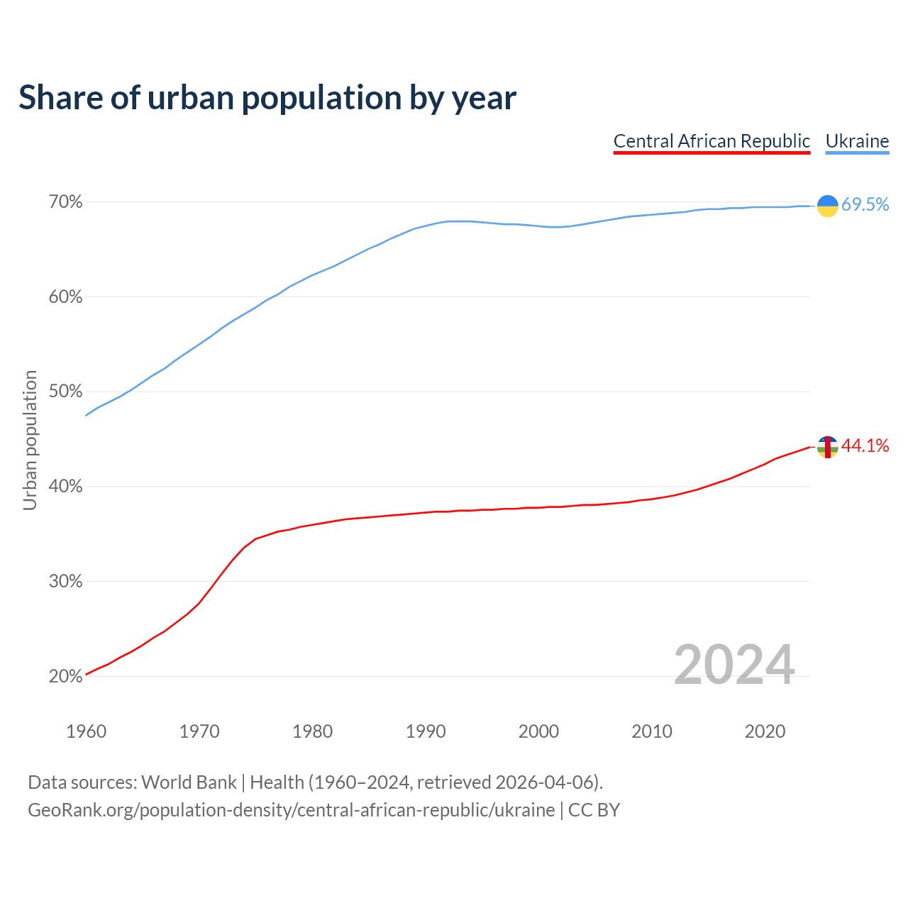 From 2004 to 2024, the share of urban population changed from 38% to 44.1% in the Central African Republic and from 67.6% to 69.5% in Ukraine.