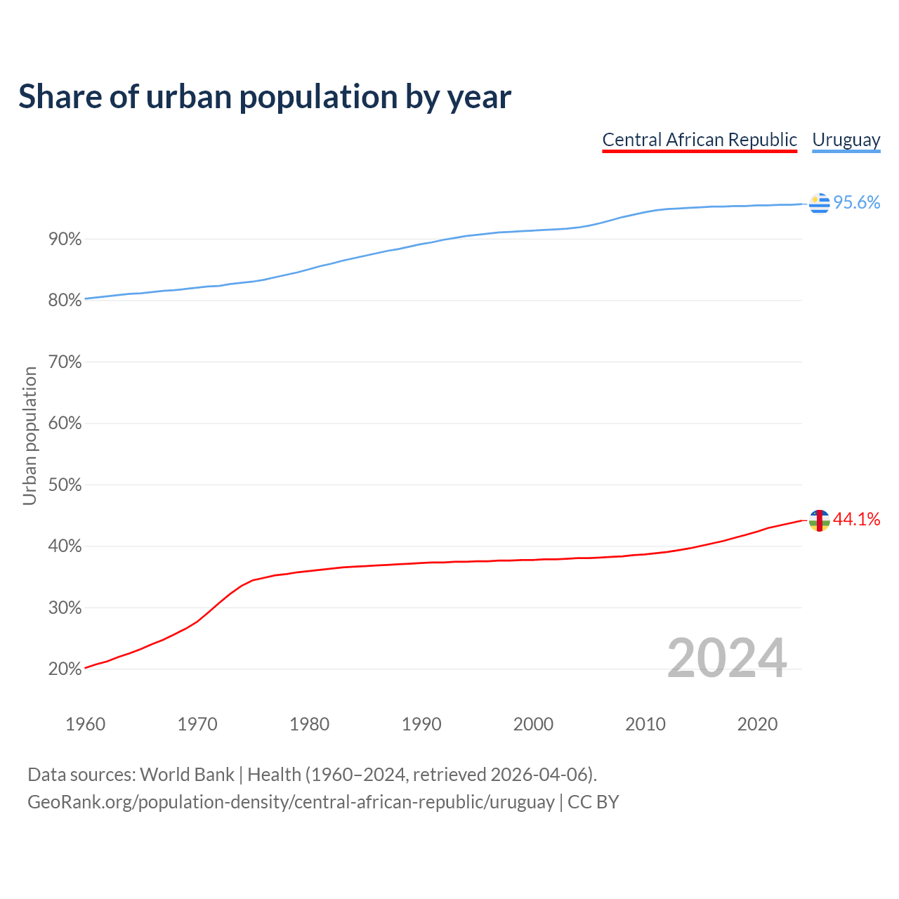 From 2004 to 2024, the share of urban population changed from 38% to 44.1% in the Central African Republic and from 91.8% to 95.6% in Uruguay.
