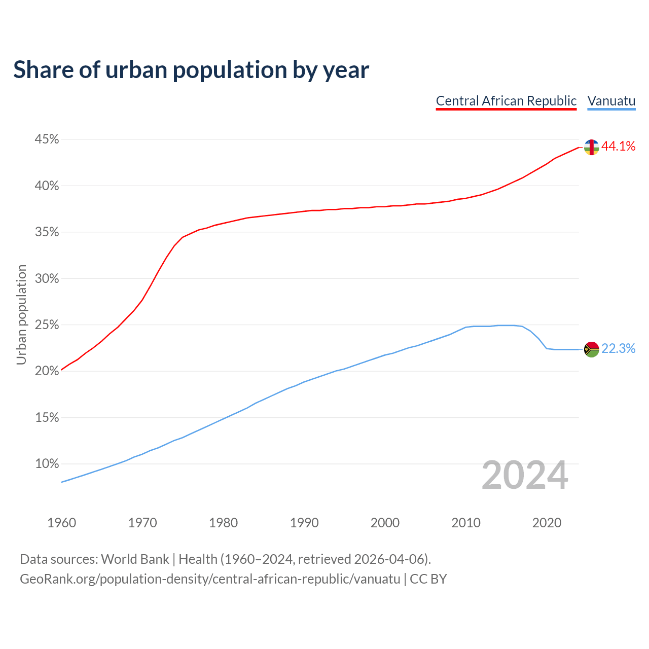 From 2004 to 2024, the share of urban population changed from 38% to 44.1% in the Central African Republic and from 22.7% to 22.3% in Vanuatu.