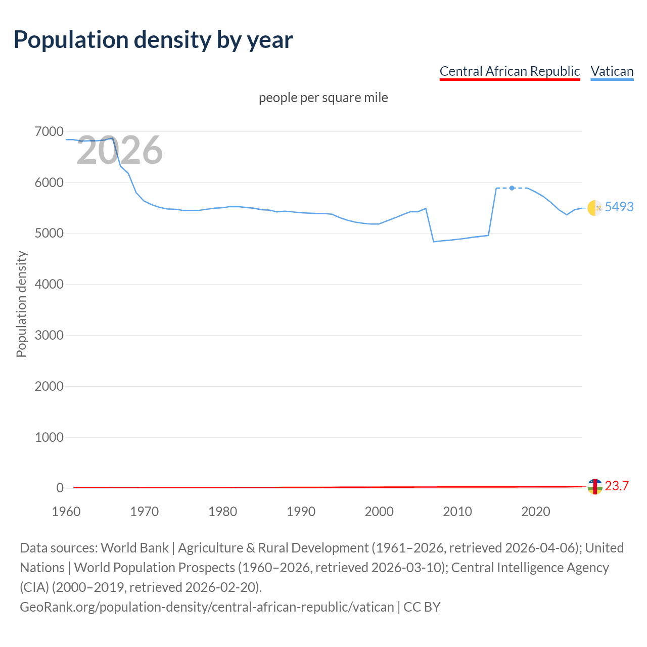 From 2006 to 2026, population density in the Central African Republic increased by 30.3%, compared to a 0.13% growth in the Vatican.