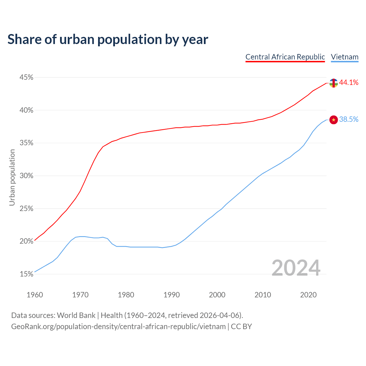From 2004 to 2024, the share of urban population changed from 38% to 44.1% in the Central African Republic and from 26.8% to 38.5% in Vietnam.